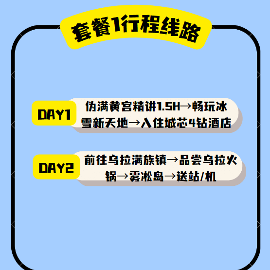 专为时间宝贵的差旅人群设计,2天1晚行程涵盖历史、自然、冰雪娱乐与美食四大维度,节奏张弛有度,不赶不累。利用一个周末或调休日即可完成,无需请长假,高效利用碎片时间,实现身心双重充电,助力职场续航。