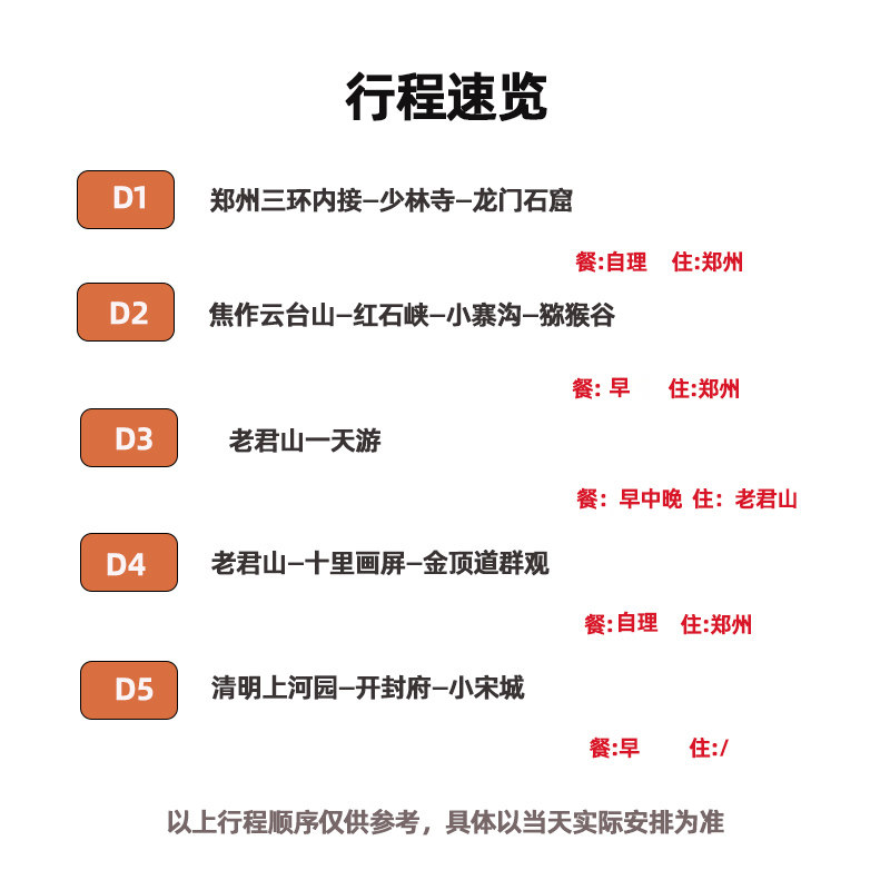 本行程专为差旅人士设计,从郑州出发,5天4晚高效串联洛阳、开封、焦作等河南核心城市,涵盖龙门石窟、少林寺、云台山、老君山等世界级人文与自然景观。行程节奏张弛有度,兼顾商务出行后的放松需求,交通衔接顺畅,节省中转时间,让您在有限假期中深度体验中原文化精髓,实现工作与度假的完美平衡。