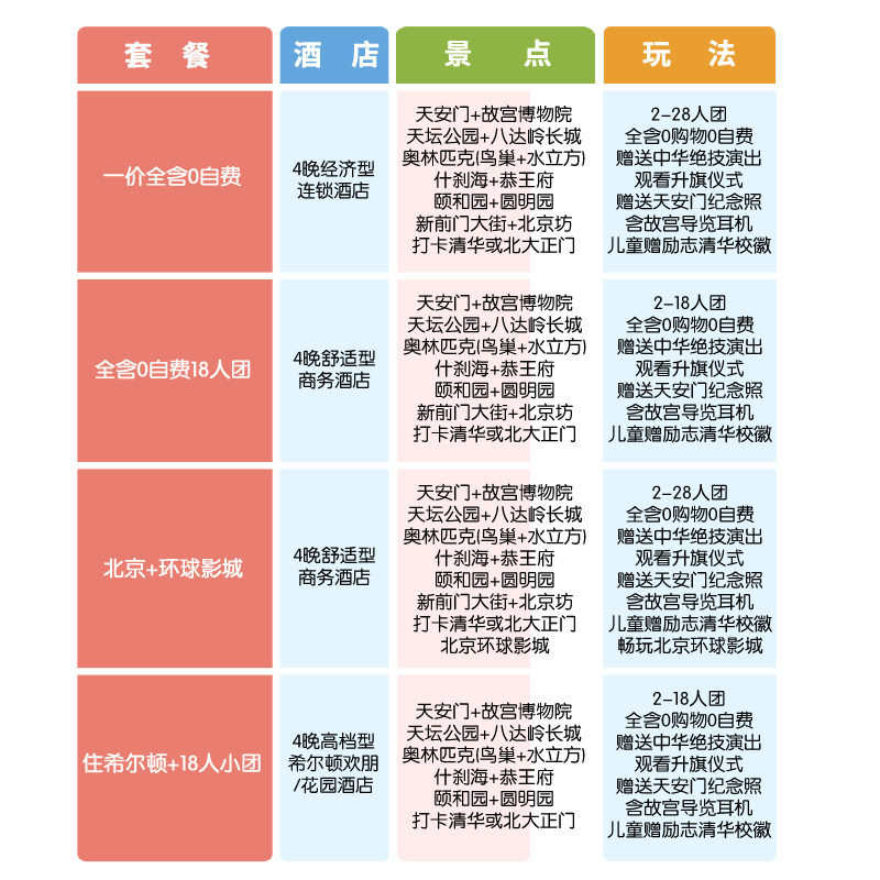 5天4晚的行程设计精准匹配多数企业年假或周末+3天小长假组合,方便差旅人士无缝衔接工作与假期。既不会因时间过短而仓促,也避免过长影响工作安排。紧凑但不赶路的日程,确保您在有限时间内深度体验北京多元魅力,返程后迅速回归职场状态,实现高效休假。