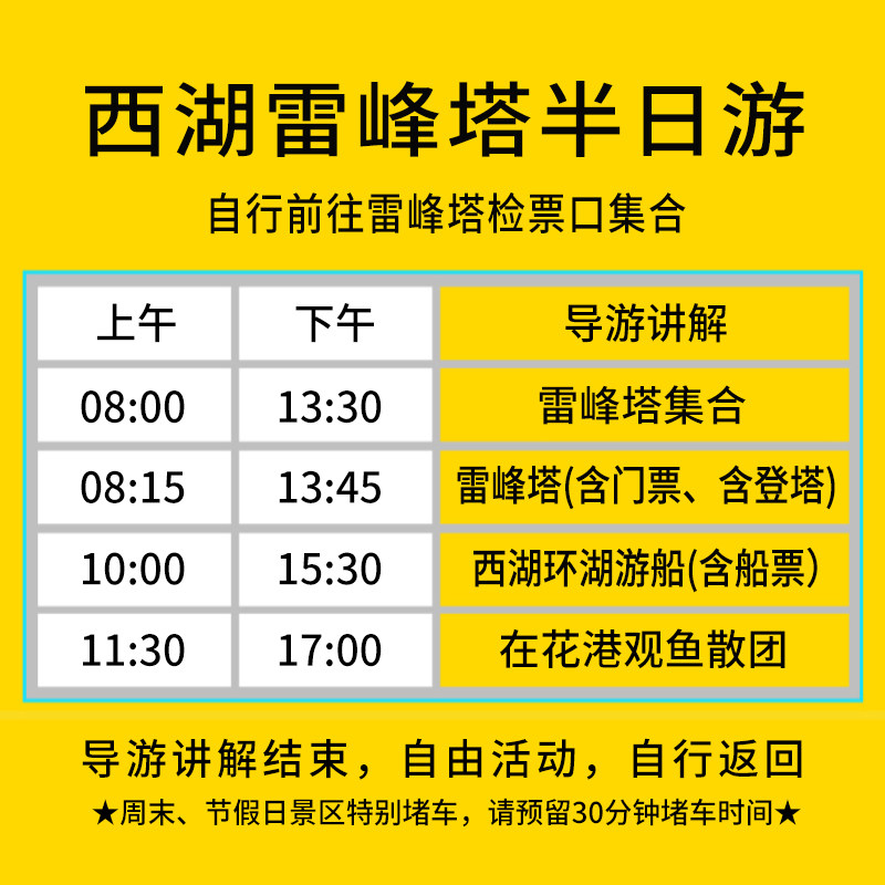 专为差旅人群打造的一站式西湖半日游,所有门票、游船费用、导游服务均已包含,无需额外操心预约或排队。您只需按约定时间集合,即可轻松开启旅程,省去繁琐规划,最大化利用有限的差旅空闲时间,真正做到省心、省时、省力。