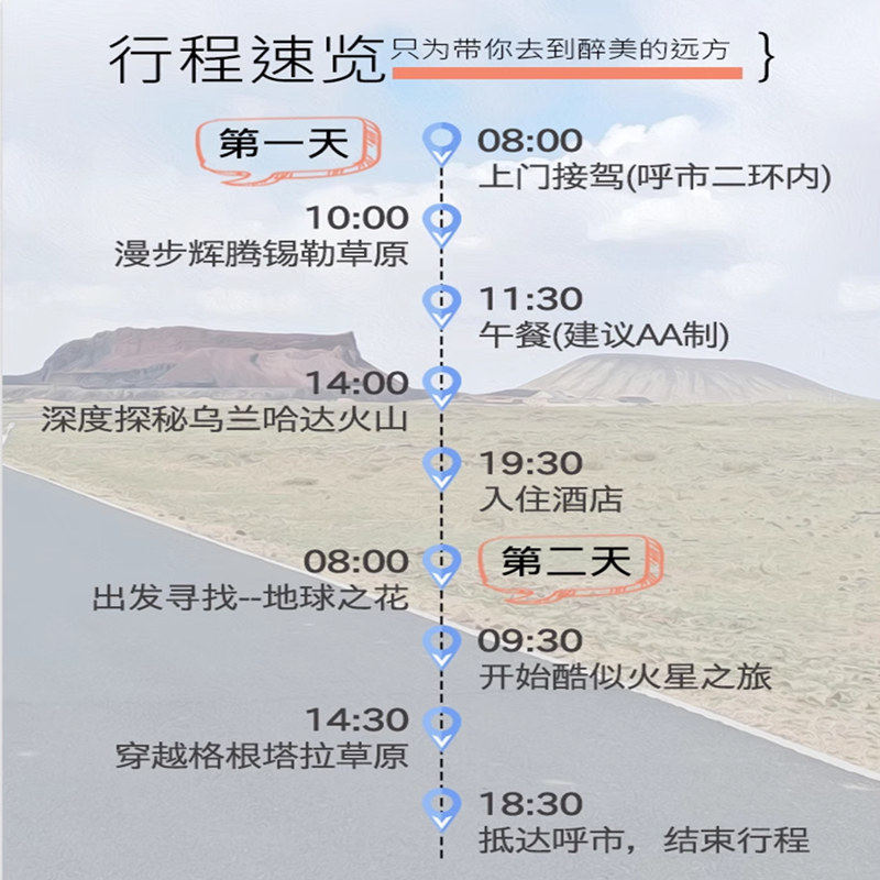 本线路支持从呼和浩特或乌兰察布两地出发,特别适合在内蒙古地区出差的商务人士。无论您是在首府处理完公务,还是在乌兰察布完成项目调研,均可无缝衔接2天1晚的草原火山之旅。行程紧凑、交通便利,无需额外中转,节省宝贵时间,让差旅之余也能轻松享受自然风光,实现工作与度假的完美平衡。