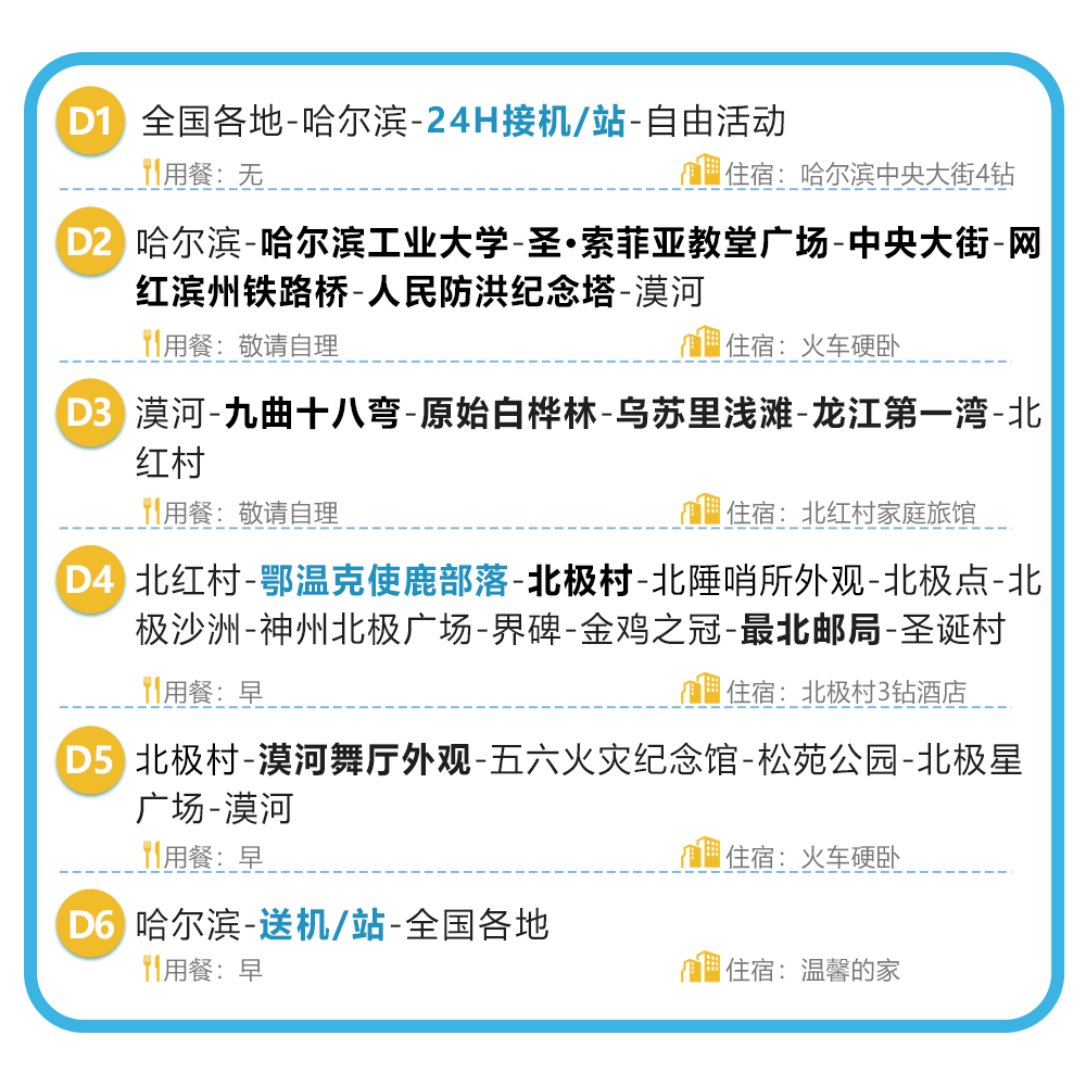 精心设计的6天5晚行程节奏张弛有度,既覆盖哈尔滨市区经典景点(如中央大街、圣索菲亚教堂),又深入漠河极地风光,适合利用年假、调休或周末延长的差旅人士。每日行程明确、不赶路,确保在有限时间内最大化体验价值。返程航班时间也经过优化,便于衔接后续工作安排,真正做到“短假长享”。