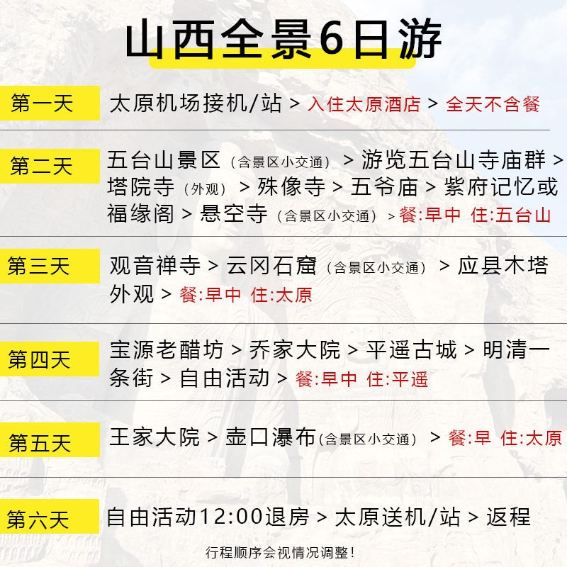 产品已包含出发地至山西的往返机票及全程地面交通,无需额外比价订票,有效控制差旅成本。对于企业报销或个人预算管理极为友好,避免隐性支出,让财务结算更清晰高效,真正实现‘拎包即走’的无忧差旅体验。