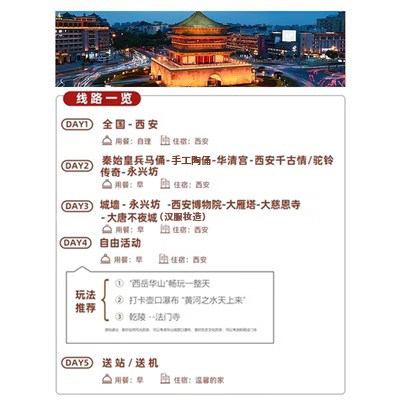 针对差旅人士有限的休假时间,行程科学压缩至5天4晚,却完整覆盖西安最具代表性的旅游资源——世界第八大奇迹兵马俑、奇险天下第一山华山、明代古城墙及网红打卡地大唐不夜城。每日安排张弛有度,避免疲劳,确保出差之余仍能高效游览,最大化利用宝贵假期。