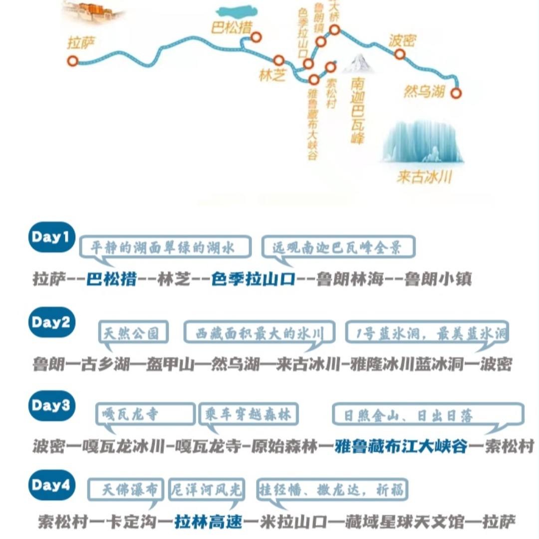 针对差旅人群易疲劳、时间紧凑的特点,行程科学安排海拔梯度:先拉萨(3650米)适应,再前往林芝(3000米以下)舒缓身心,有效预防高反。每日车程合理控制,避免过度奔波,确保您在有限假期中既能领略极致风光,又能保持良好状态返岗复工。
