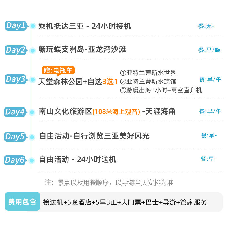 本行程支持单人预订,无需拼团等待,特别适合出差间隙或独自出行的商务人士。在繁忙工作之余,您可随时开启6天5晚的三亚休闲之旅,兼顾效率与放松。行程安排紧凑而不仓促,既能快速切换至度假模式,又不耽误后续差旅计划,是现代职场人理想的“说走就走”之选。