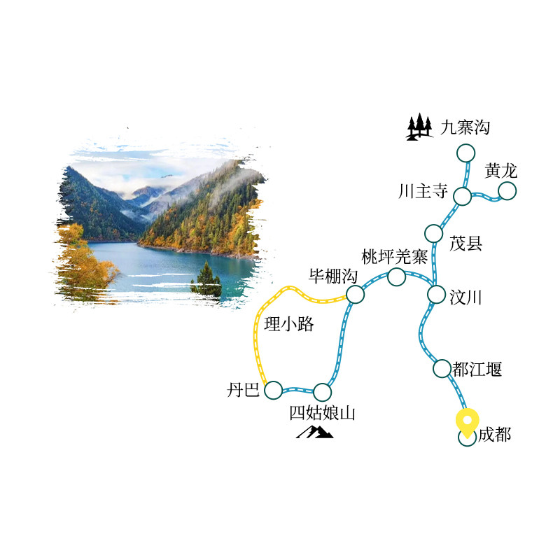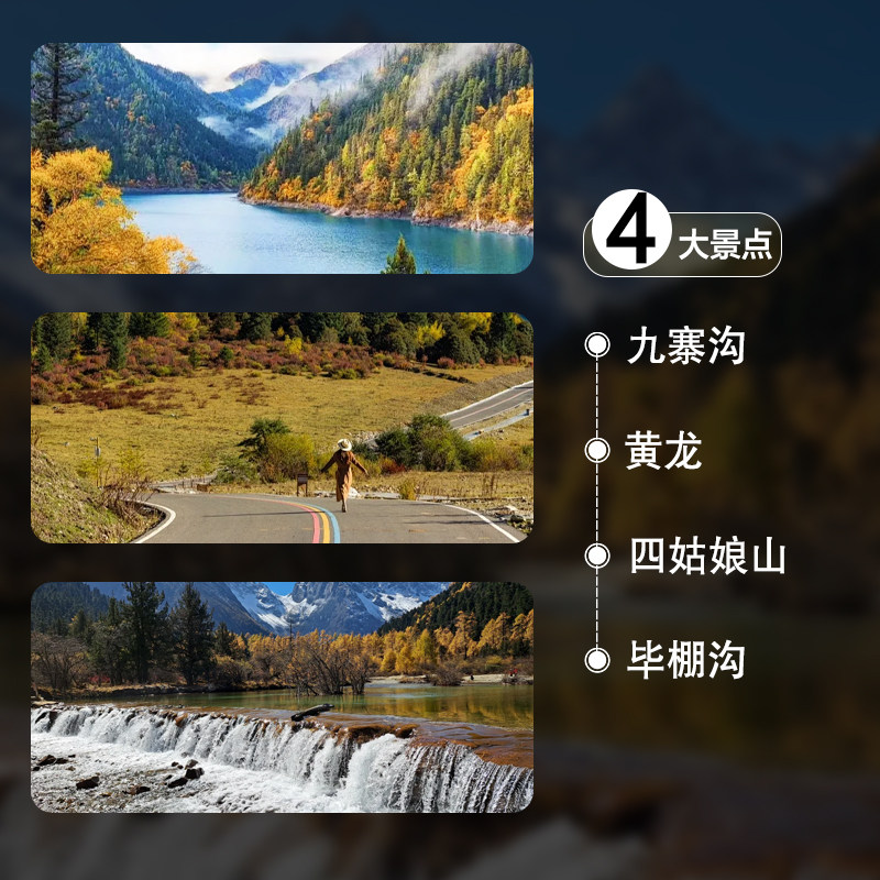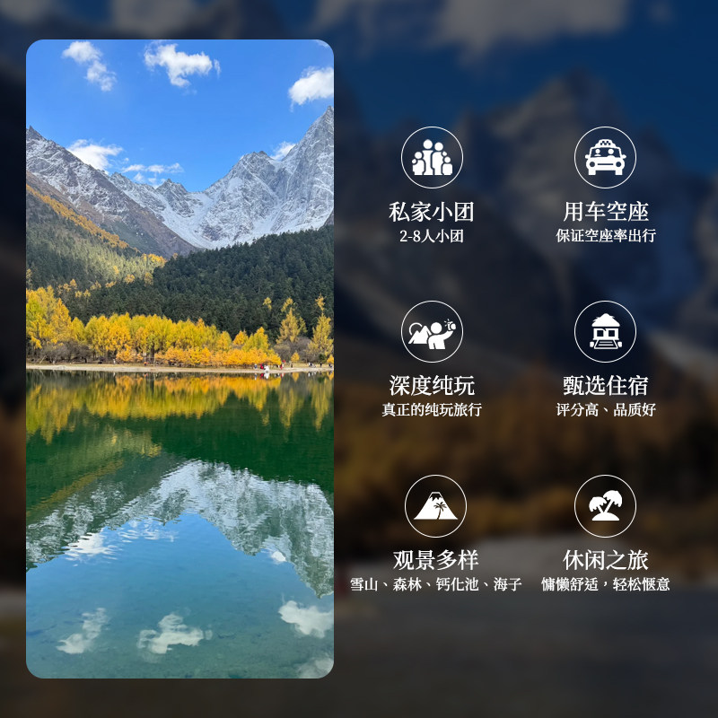 线路串联九寨沟、黄龙、四姑娘山与毕棚沟四大国家级风景名胜区,涵盖湖泊、钙华池、雪山、冰川、森林与温泉等多元地貌。对差旅频繁但假期有限的人士而言,一次出行即可领略川西最精华的自然景观,避免多次奔波,实现‘一次旅行,多重体验’的高效度假目标。