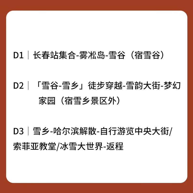 本线路专为差旅人士设计,从长春站清晨7点集合出发,交通衔接高效便捷。无论您是独自出差途中抽空度假,还是临时起意开启周末冰雪之旅,均支持1人报名参团,无需拼团等待。行程安排紧凑合理,3天2晚涵盖雾凇岛、雪谷、雪乡及哈尔滨核心景点,让您在有限差旅时间内深度体验北国冰雪奇观,兼顾效率与休闲。