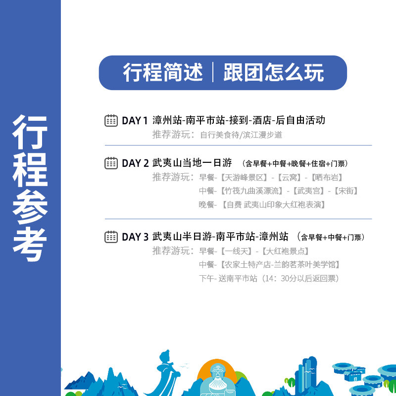 本行程专为差旅人士设计,从漳州站出发,搭乘便捷动车直达南平市站,全程交通无缝衔接,节省宝贵时间。抵达后即有专车接驳至武夷山三姑度假村,避免繁琐换乘,让商务出行后的放松之旅轻松开启。往返动车票已含在费用中,无需额外操心购票与班次安排,真正实现高效差旅与深度度假的完美融合。