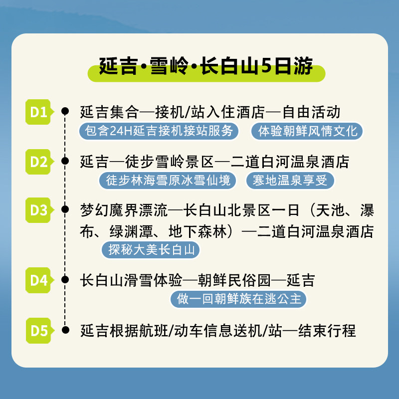 精心规划的5天4晚行程,从延吉出发直达长白山天池、雪岭及漂流区域,路线高效无冗余。既满足差旅人士对时间的严苛要求,又确保深度游览长白山核心景观,实现工作与休闲的完美平衡,避免长途奔波浪费宝贵假期。