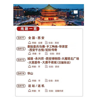 5天4晚的行程长度精准匹配多数企业年假或调休安排,周五出发、下周二返岗,最大限度减少请假天数。行程前段聚焦高强度文化景点(如兵马俑),后段安排轻松夜游与自由活动,符合差旅人士“先紧后松”的身心节奏。酒店位置优越,交通便利,确保每日高效往返,不耽误次日工作衔接。