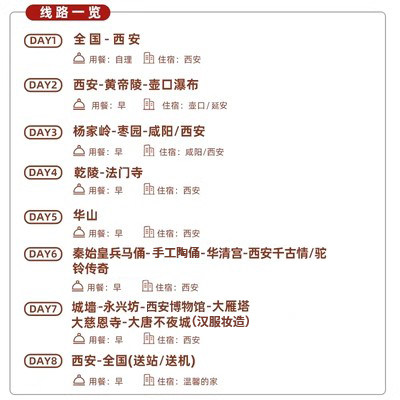 本行程以西安为枢纽,巧妙串联延安、咸阳、渭南、宝鸡等陕西核心城市,特别适合商务差旅后顺道度假的旅客。8天7晚的节奏兼顾效率与深度,既可快速打卡兵马俑、华山、壶口瀑布等标志性景点,又能深入体验乾陵、大唐芙蓉园等文化地标,实现‘出差+旅游’无缝衔接,最大化利用有限假期。