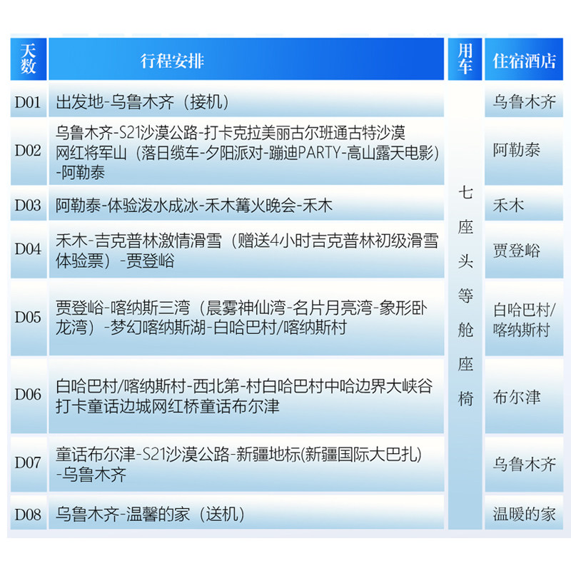 行程以乌鲁木齐为起终点,便于差旅人士利用航班中转或会议间隙直接加入。乌鲁木齐作为新疆交通枢纽,航班密集、配套成熟,可高效衔接国内外商务行程。全程专车接送、住宿安排合理,最大限度减少交通耗时,确保您在有限假期中获得最大化的度假收益,真正实现‘落地即度假’的差旅理想。