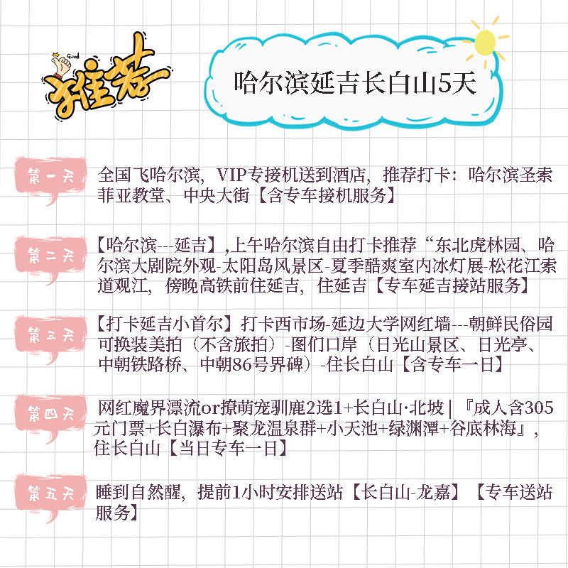 针对差旅人群对时间效率与体验质量的双重需求,行程特别包含2天专属用车服务,由专业司机兼向导全程陪同,灵活安排景点停留时长。全程100%纯玩无购物,杜绝隐形消费和无效停留,让您在5天4晚内高效打卡长白山天池、延吉网红墙、图们口岸等核心景点,真正实现‘说走就走’的高品质差旅度假。