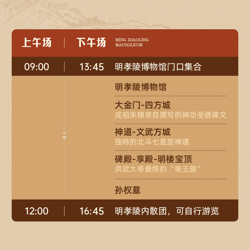 区别于普通观光团,本产品由“大咖说&bikego”联合打造,邀请历史文化领域专家担任讲解员,以学术视角解读明孝陵背后的政治、风水与艺术密码。差旅途中不仅能放松身心,更能拓展知识边界,为商务社交增添谈资与文化资本。
