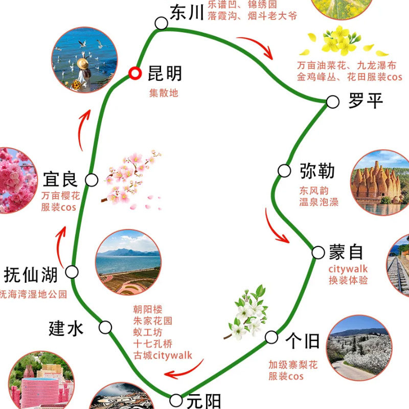 本行程专为差旅人士设计,从昆明出发,无缝衔接曲靖、红河等目的地,涵盖元阳梯田、罗平油菜花、建水古城、东川红土地及宜良樱花等标志性景观。路线规划合理,每日车程适中,兼顾工作与休闲节奏,适合在商务出差之余安排短途深度度假,实现高效出行与身心放松的双重目标。