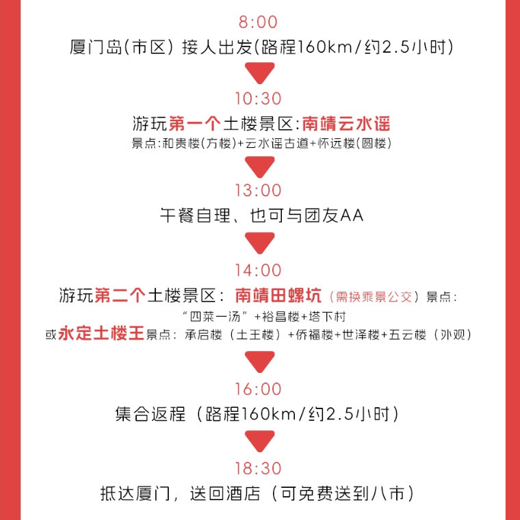 精心设计的一日精华行程,清晨从厦门出发,傍晚返回,全程约8-10小时,完全适配差旅人士的周末或单日空闲时段。无需请假或延长出差时间,即可完成一次高质量的文化度假体验。