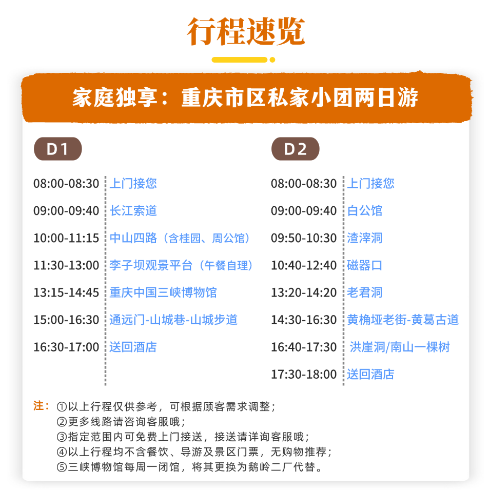 专为差旅人士设计的重庆2日私家团,支持单人预订,无需拼团等待,行程随时启程。无论是出差间隙的小憩,还是临时起意的城市探索,都能快速响应、高效安排。全程包车服务,免去公共交通换乘烦恼,让您的差旅时光更从容、更自由,真正实现说走就走的便捷体验。