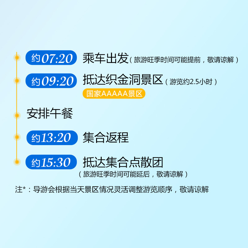 采用2-8人精品小团模式,避免大型团队的拥挤与低效,更适合注重效率与体验的差旅人士。行程紧凑合理,上午出发、傍晚返回,不占用过多工作时间,同时保证深度游览织金洞核心景观,满足差旅中对品质与效率的双重需求。