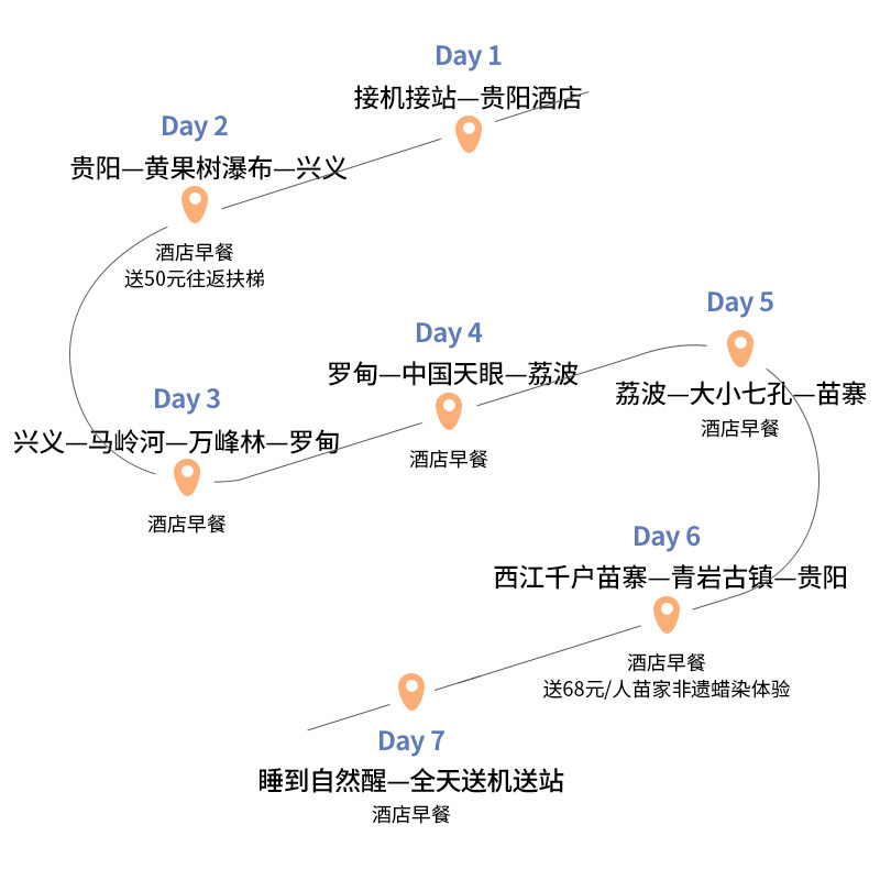 7天6晚的行程采用‘核心景点+自由活动’的半自由行结构,前几日集中游览黄果树、小七孔、天眼等必打卡地,后段预留充足自由时间,方便差旅人士根据实际工作结束时间灵活调整。您可选择在青岩古镇慢逛、在黔东南苗寨写生,或回酒店休整,真正实现工作与度假的无缝融合。