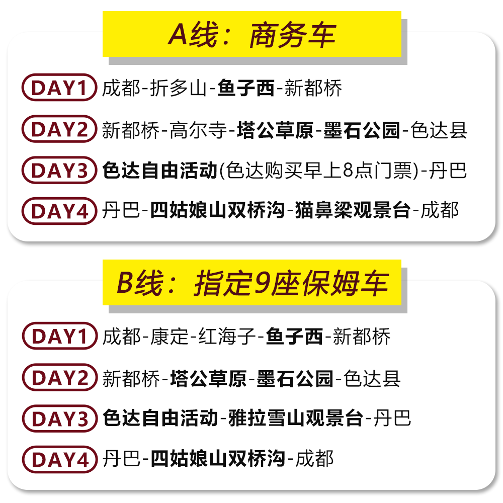 专为周末或短假差旅人群设计4天3晚行程,从成都出发,覆盖甘孜、阿坝核心景点,时间安排张弛有度。既避免长途跋涉的疲惫,又确保关键体验不缩水。周五下班出发、周一清晨返程的可行性极高,最大化利用有限假期,让短暂差旅也能收获完整而深刻的川西记忆。