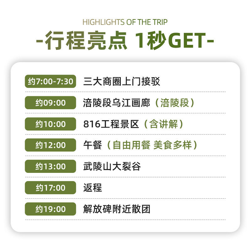 本线路特别设计为上午9点后出发,充分照顾差旅人士的前一晚会议或航班抵达安排,避免清晨赶路的疲惫。无论是前一天深夜抵渝的商务旅客,还是希望在市区处理完上午事务再出发的职场人士,都能轻松衔接行程,实现工作与休闲的无缝切换,真正兼顾效率与体验。