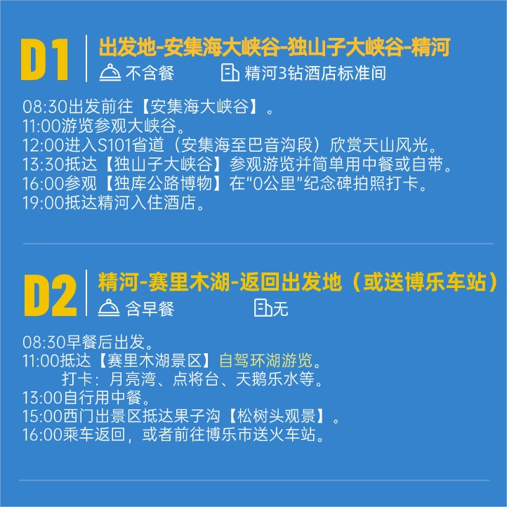 2日内高效覆盖北疆三大标志性景观——赛里木湖、独山子大峡谷、安集海大峡谷,避免长途跋涉。特别适合首次到访新疆的差旅人士,在有限时间内快速领略西域地貌多样性与自然雄奇,提升行程价值密度。