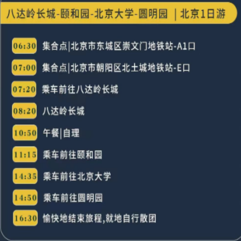 本行程专为差旅人士设计,全程包含八达岭长城、颐和园、圆明园三大世界文化遗产的门票、往返交通及专业讲解服务,省去您自行预约、排队、打车等繁琐环节。无论是商务出差间隙的短途放松,还是会议结束后的文化体验,都能高效安排、无缝衔接,让您在有限时间内深度感受北京的历史底蕴与皇家园林魅力。