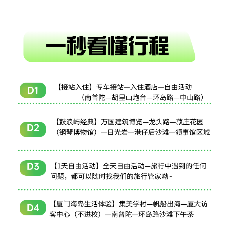 本行程支持单人预订,特别适合商务出差间隙或独自出行的旅客。无需等待拼团,随时下单即可开启4天3晚的厦门深度之旅。无论是临时决定放松身心,还是利用周末延长差旅假期,都能快速成行,省去协调多人时间的繁琐,让您的差旅生活更自由、更高效。
