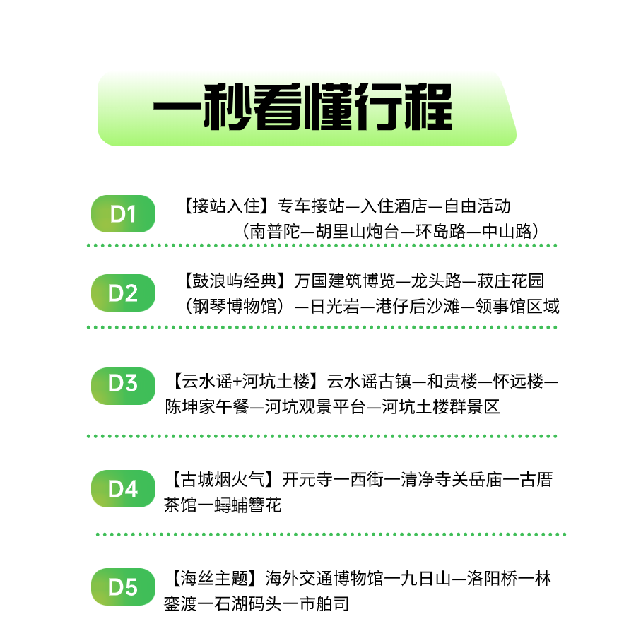本行程专为商务差旅或独自度假人士设计,支持单人成行,无需拼团等待。无论您是临时出差顺道放松,还是独自开启文化探索之旅,都能即订即走,灵活安排时间。厦门、漳州、泉州三地交通便捷,高铁与高速网络发达,从厦门出发轻松串联闽南精华景点,让您的差旅兼具效率与休闲体验。