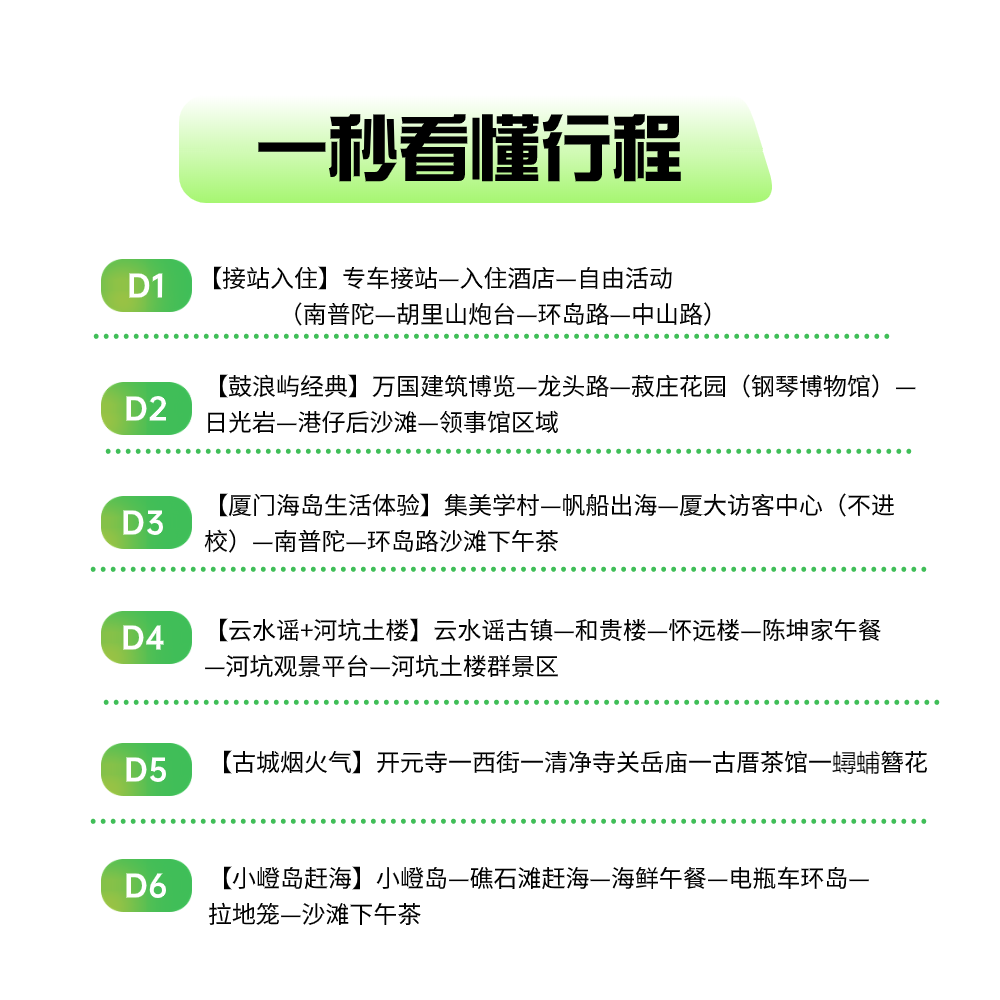 本行程专为现代差旅人士设计,支持单人预订,无需拼团等待,极大提升出行灵活性。无论是结束厦门会议后的短途放松,还是利用周末延伸至漳州、泉州的深度文化之旅,6天5晚的节奏张弛有度。行程涵盖鼓浪屿、开元寺、云水谣等标志性景点,兼顾高效与休闲,让商务出行也能拥有度假质感,真正实现‘出差即度假’的理想状态。