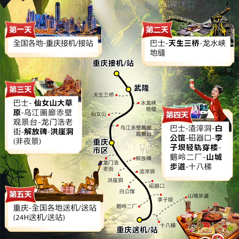 5天4晚行程科学规划,涵盖洪崖洞夜景、李子坝网红轻轨、仙女山草原等必游地标,避免走马观花。差旅游客可在有限时间内高效完成重庆核心IP打卡,节省自行研究路线的时间成本,最大化利用碎片化假期。
