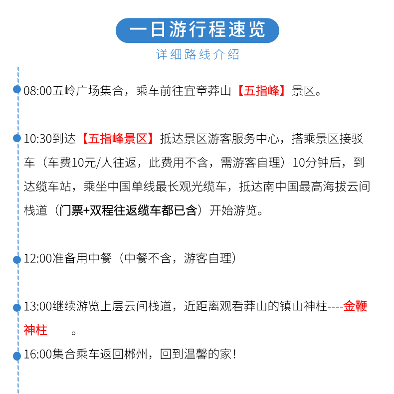专为商务差旅人士设计的郴州莽山五指峰一日游,全程无需徒步爬山,节省体力、高效游览。景区配备现代化无障碍缆车系统,可直达核心观景点,让您在紧凑的差旅日程中轻松享受自然风光,兼顾效率与休闲,是出差途中放松身心的理想选择。