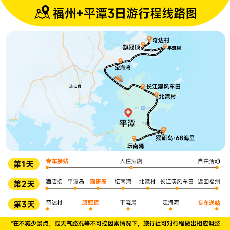 行程起点与目的地均为福州,对于在福州出差或会议结束的商务人士而言,无需长途奔波即可无缝切换至度假模式。平潭岛距福州市区仅约2小时车程,交通便利,极大节省差旅中的中转等待时间。利用周末或会议间隙,快速开启海岛慢生活,高效平衡工作与休闲,提升差旅整体体验感与满意度。