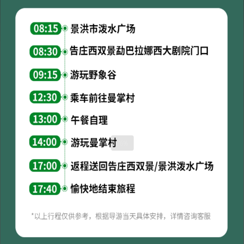 本线路支持单人预订,无需拼团等待,特别适合商务差旅人士在紧凑日程中灵活安排休闲时光。无论您是独自出差还是临时起意放松身心,只需一人下单即可成行,省去协调多人时间的麻烦。行程设计紧凑高效,一日内完成野象谷与曼掌村的深度体验,兼顾自然探索与文化沉浸,让差旅中的碎片时间转化为高质量度假体验。