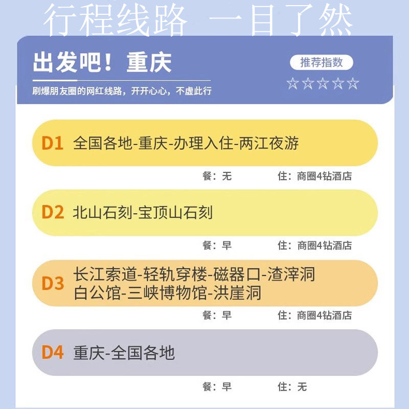 区别于传统观光团,本产品融合“人文旅行”“网红打卡”“当地美食”三大主题,精准匹配现代差旅人群对深度、趣味与效率的综合期待。无论是想了解巴蜀文化、拍摄潮流大片,还是大快朵颐地道风味,4天3晚的行程都能高效覆盖,让短暂的重庆停留成为一次高性价比的复合型度假体验。