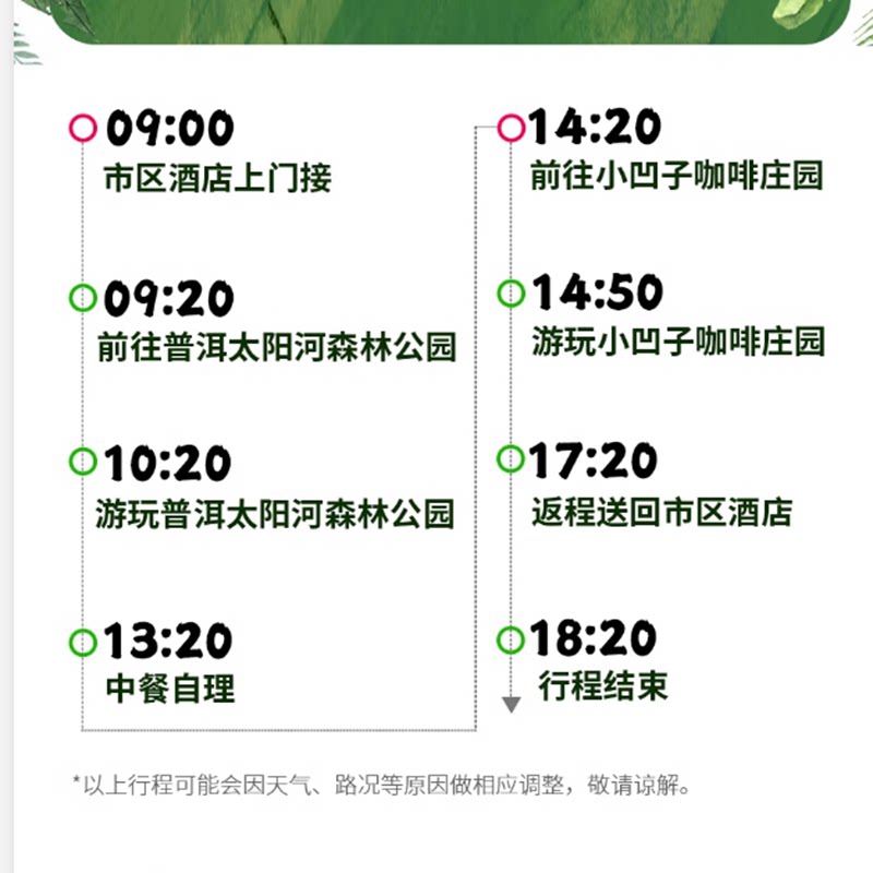 充分考虑差旅人士对效率与便捷的需求,产品包含普洱市区往返接送及所有景点门票、电瓶车费用,真正实现‘拎包即游’。无需自行规划路线、排队购票,节省宝贵时间与精力。专业司机与导游全程陪同,确保行程顺畅无忧,让您专注于享受而非琐事。