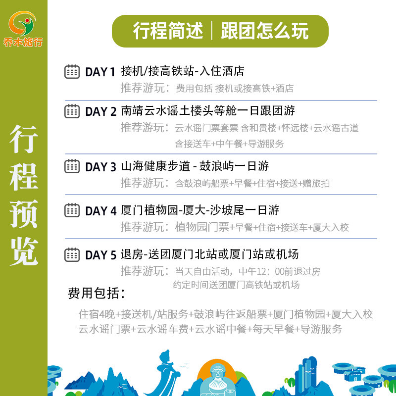本行程专为差旅人士设计,支持1人即可成行,无需等待拼团满员,极大提升商务出行后的度假效率。5天4晚的紧凑安排涵盖鼓浪屿、南靖土楼与厦门植物园等核心景点,既满足工作间隙的短暂休整需求,又不失深度体验。小团规模(2-16人)确保服务品质与行程灵活性,适合出差后顺道放松或周末延伸假期的高效旅行者。