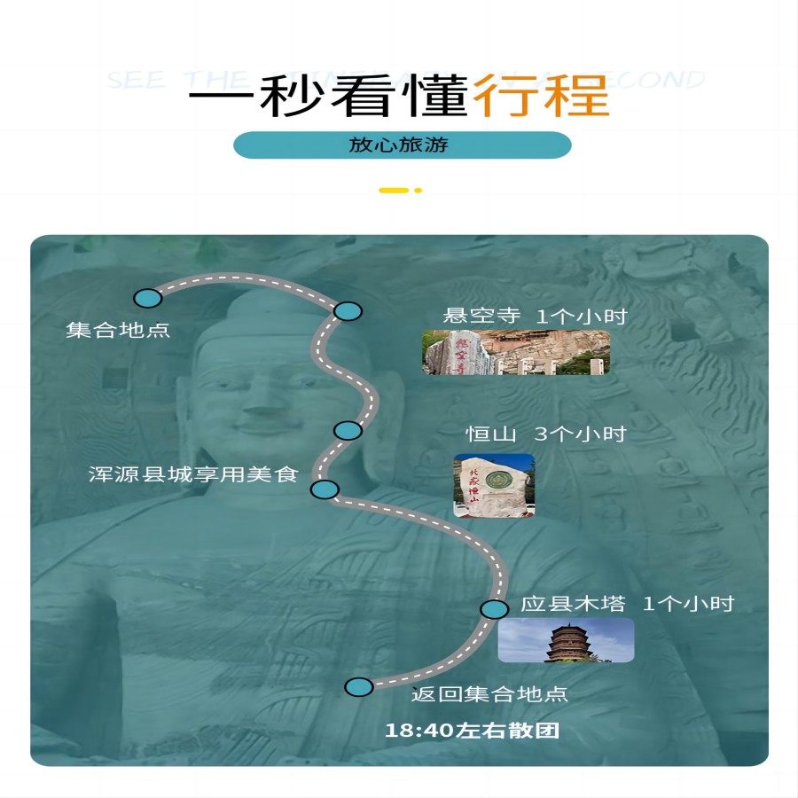 线路覆盖大同与朔州两大晋北重镇,方便在两地均有公务安排的差旅人士顺道游览。从大同出发,一日内串联恒山、悬空寺与应县木塔(位于朔州应县),实现跨行政区的高效文化巡礼。无需额外规划交通与住宿,一站式解决多城差旅中的碎片化时间利用问题,让每一次出行都富有收获。