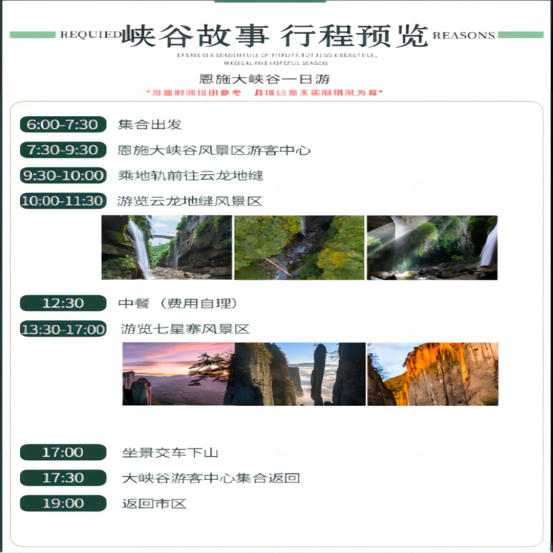 行程起点与终点均设在恩施市区,无需额外前往异地集合点,极大节省交通成本与时间。对于已在恩施出差的商务人士而言,只需利用半天或一天空闲,即可开启高品质自然之旅。这种‘就地度假’模式,让差旅中的休闲变得触手可及,无需额外安排行程衔接。