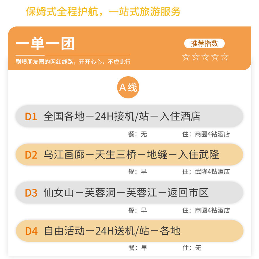 专为差旅人士设计的重庆4天3晚私家团,行程灵活、节奏可控,既满足高效出行需求,又兼顾深度度假体验。包车服务省去交通换乘烦恼,从市区会议结束即可直奔武隆天坑地缝,实现工作与旅行的无缝衔接。全程1人可订,无需拼团等待,让您的差旅时光更自由、更高效。