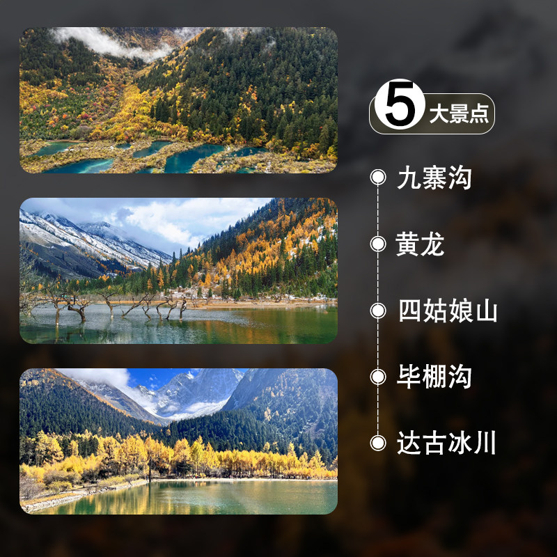 在仅6天时间内,高效串联九寨沟、黄龙、四姑娘山、毕棚沟与达古冰川五大核心目的地,避免走马观花。路线经专业规划,减少无效行车时间,确保每日核心游览时长。对年假有限的职场人而言,这是用最短时间收获最大自然震撼的差旅优选方案。