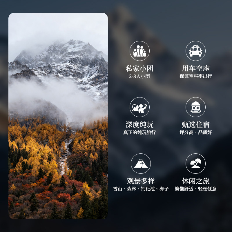 本行程专为差旅人士设计,从成都出发,无缝衔接九寨沟、黄龙、四姑娘山等世界级自然景区。6天5晚的紧凑安排兼顾高效与深度体验,适合在完成商务任务后即刻开启度假模式。私家小团形式确保行程灵活可控,避免大团等待,最大化利用有限假期时间,是商务差旅者实现工作与放松平衡的理想选择。