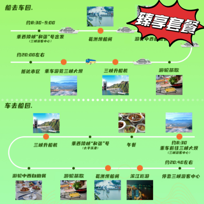 本线路专为宜昌本地或已在宜昌出差的旅客设计,无需长途交通接驳,节省时间与精力。无论是商务间隙还是会议结束后,都能轻松开启一段高品质的三峡之旅。从市区便捷登船,即刻沉浸于“两坝一峡”的壮丽山水之中,真正实现差旅与度假的无缝衔接,让短暂假期也能充分享受自然与人文的双重馈赠。