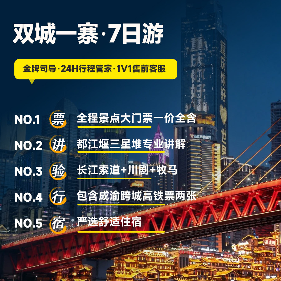 本行程专为差旅人士设计,支持1人独立成团,无需拼团等待,极大提升出行效率。无论是临时出差顺道度假,还是独自探索川渝文化,都能即订即走,行程安排灵活自由。私家团模式确保您拥有专属用车与导游服务,兼顾商务出行的高效性与休闲度假的舒适感,真正实现工作与旅行的无缝衔接。