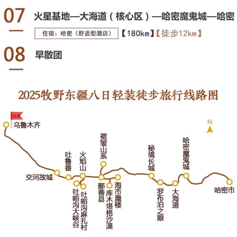 8日时长科学规划,完美适配国家法定长假或企业年假制度。从乌鲁木齐出发,经吐鲁番、哈密至罗布泊边缘,环线设计避免重复路线,最大化利用假期时间。每日行程张弛有度,兼顾探险强度与休整需求,确保差旅人士返程后迅速恢复工作节奏,无‘假期后遗症’。
