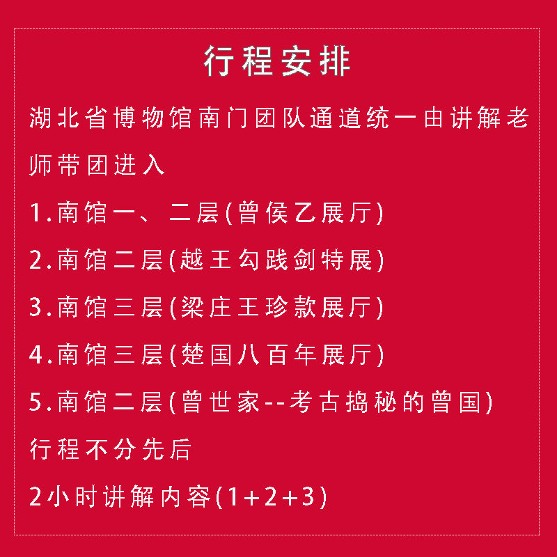 区别于嘈杂大团,本产品严格控制在15人以内,营造安静有序的参观环境,特别适合注重效率与体验的差旅人群。小团不仅便于管理、动线灵活,还能在讲解间隙与同好交流观点,拓展人脉。无论是独自出差还是结伴同行,都能在轻松氛围中深度感受湖北千年文脉,兼顾专业性与舒适度。