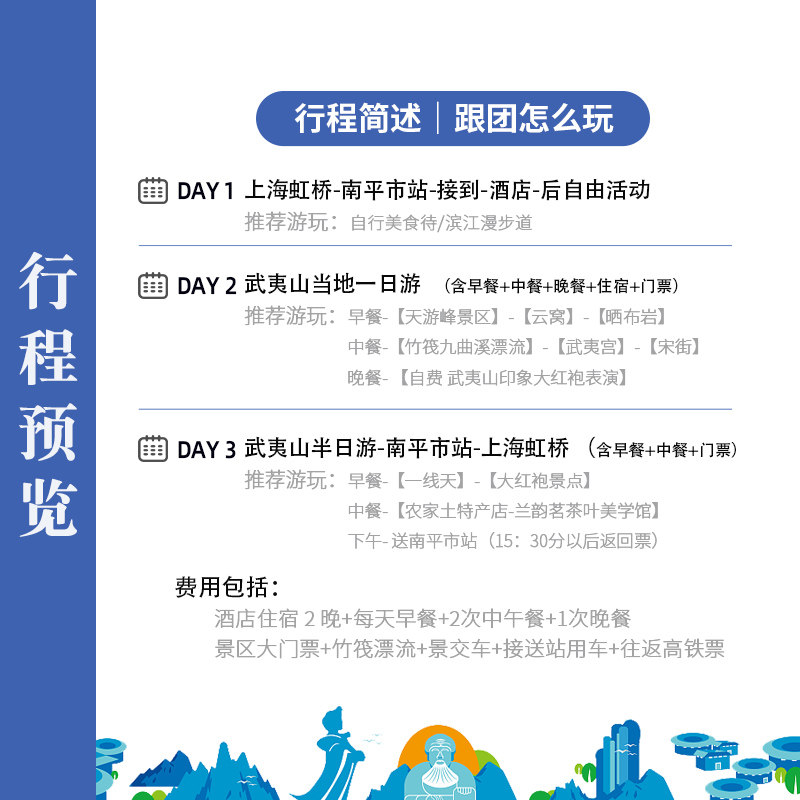 费用包含上海往返南平市站高铁票及当地全程交通(含景交车、接站车),彻底解决差旅人士异地交通衔接难题。无需自行研究线路或打车,从出发地到景区无缝对接,最大化利用碎片化时间,提升整体出行效率与舒适度。