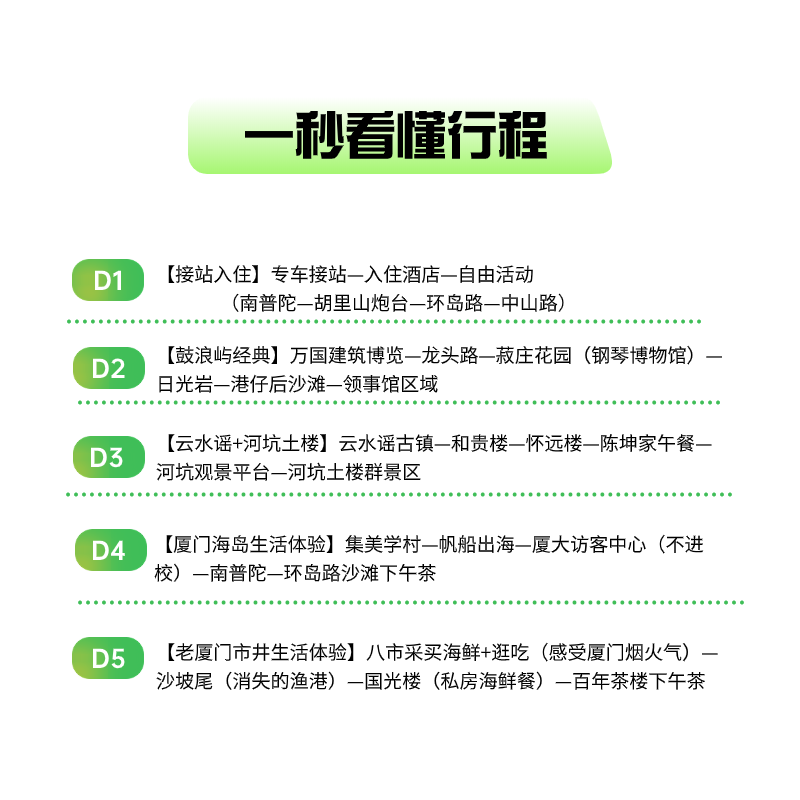 本行程专为商务或独自出行的差旅人士设计,支持1人单独预订,无需拼团等待,极大提升出行灵活性。无论是临时出差后的短途放松,还是利用周末开启小长假,5天4晚的厦门漳州之旅都能轻松衔接工作与休闲。行程涵盖鼓浪屿、云水谣、土楼等经典目的地,兼顾效率与体验,让差旅不再只是奔波,而是一场身心的充电之旅。