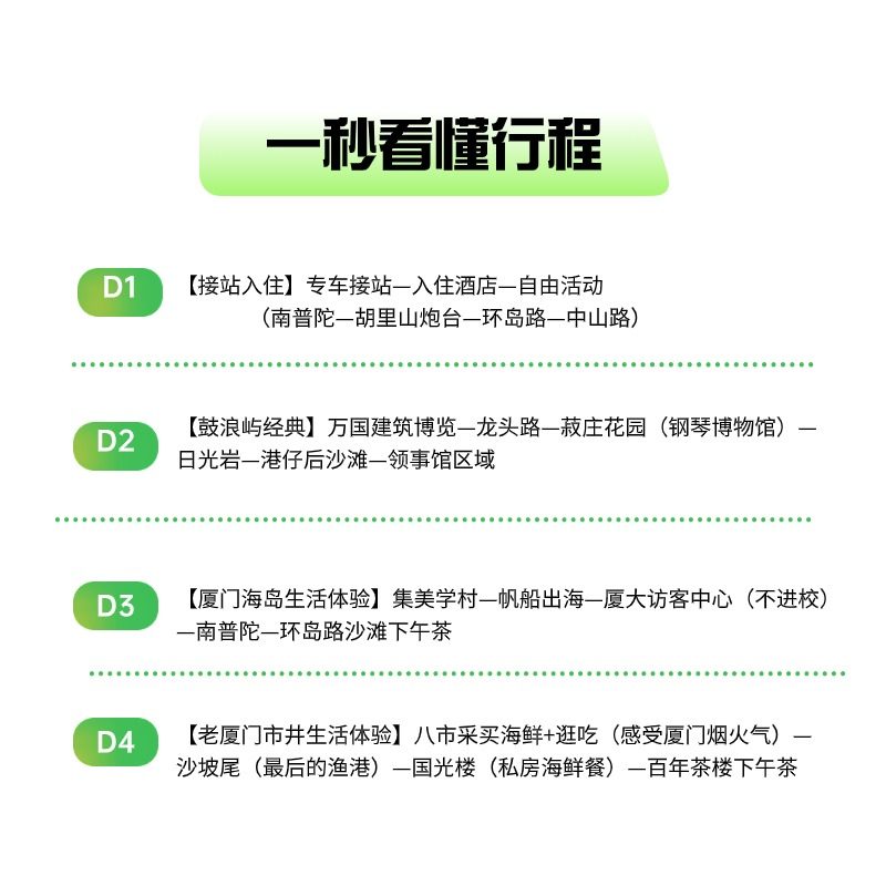 本行程支持1人单独预订,无需拼团等待,特别适合商务出差间隙或独自度假的旅客。无论是临时起意的小憩,还是工作之余的放松之旅,都能即刻启程。小团模式保障服务品质,同时兼顾灵活性与私密性,让您的厦门差旅兼具效率与惬意,轻松实现从会议室到海风沙滩的无缝切换。